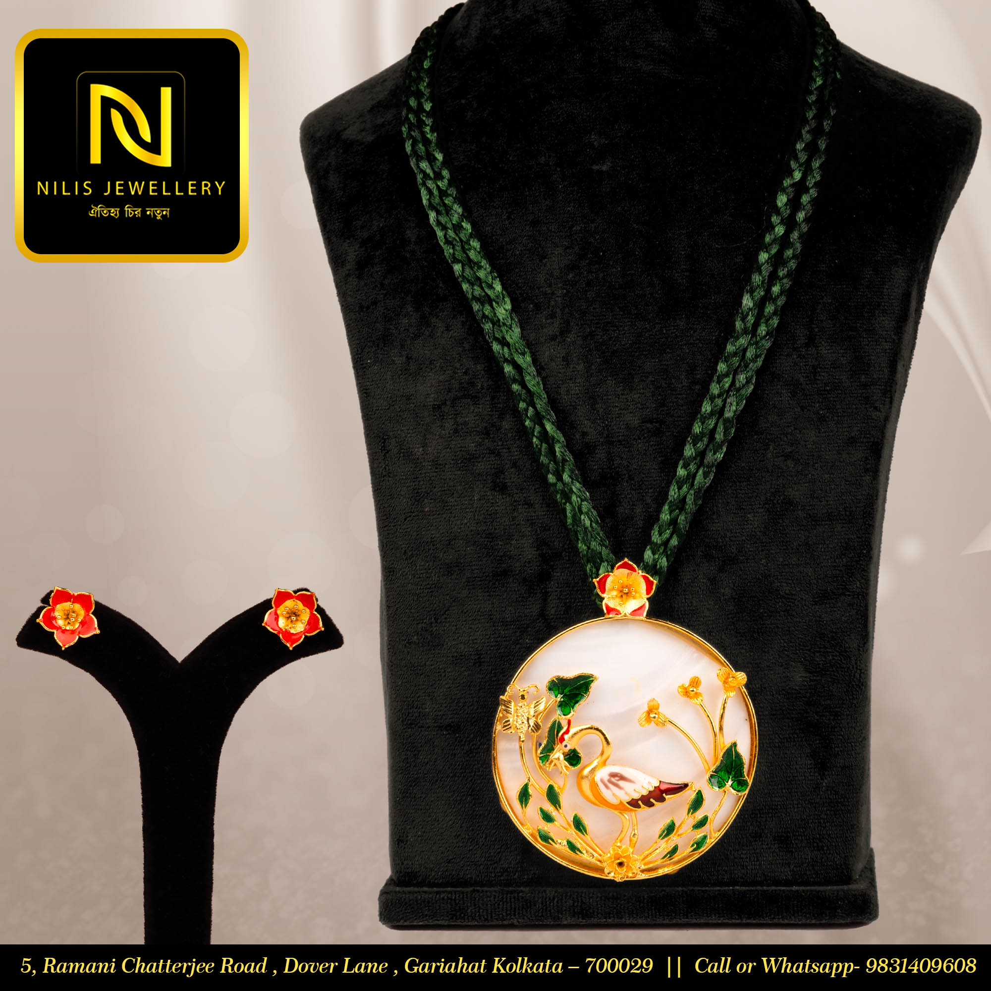 | Make a bold and elegant statement with this large-sized handcrafted pendant set, blending the soft glow of mother of pearl with intricate meenakari detailing.