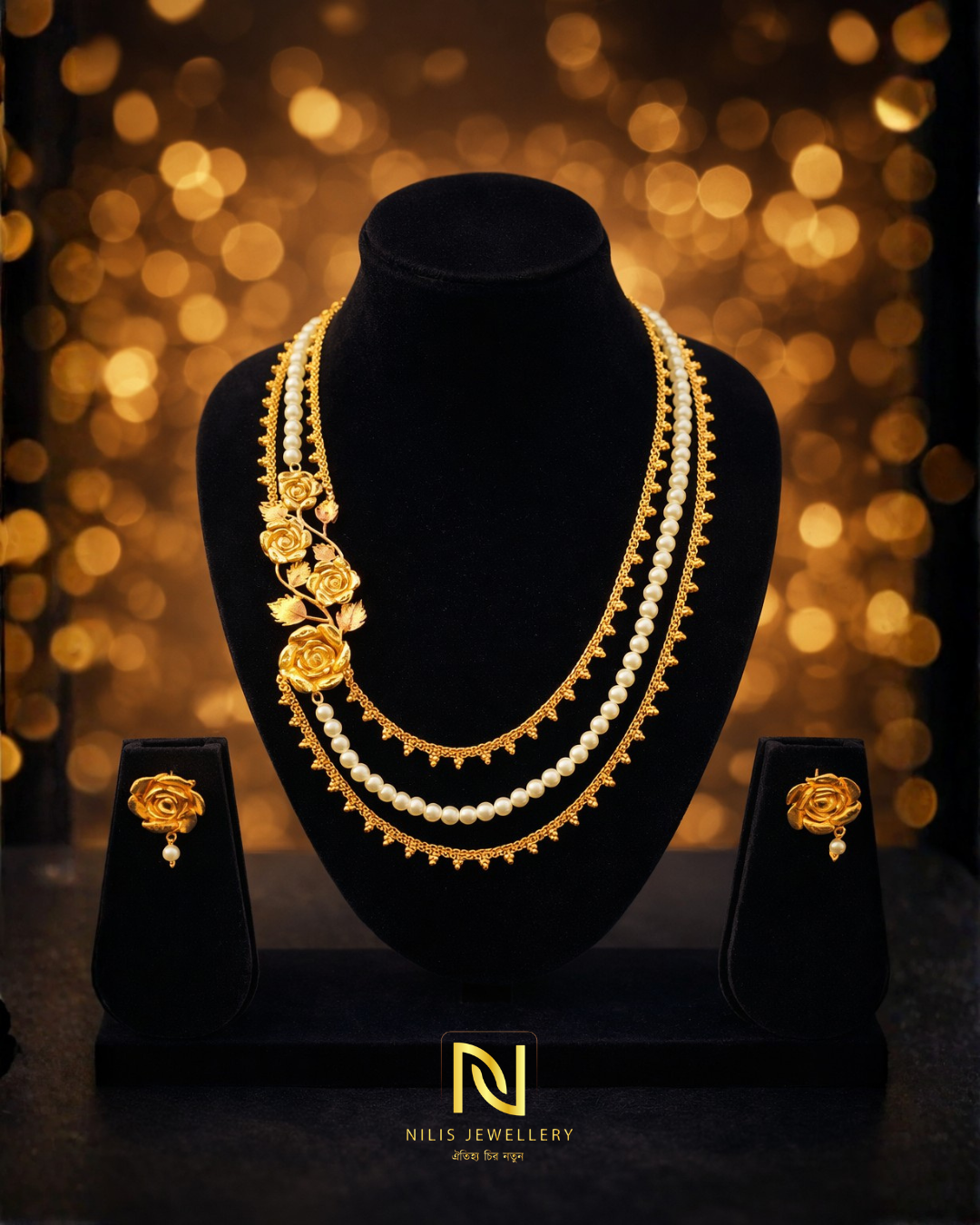A graceful blend of royal gold finish and timeless pearl elegance — perfect for weddings, festive occasions & grand traditional looks.