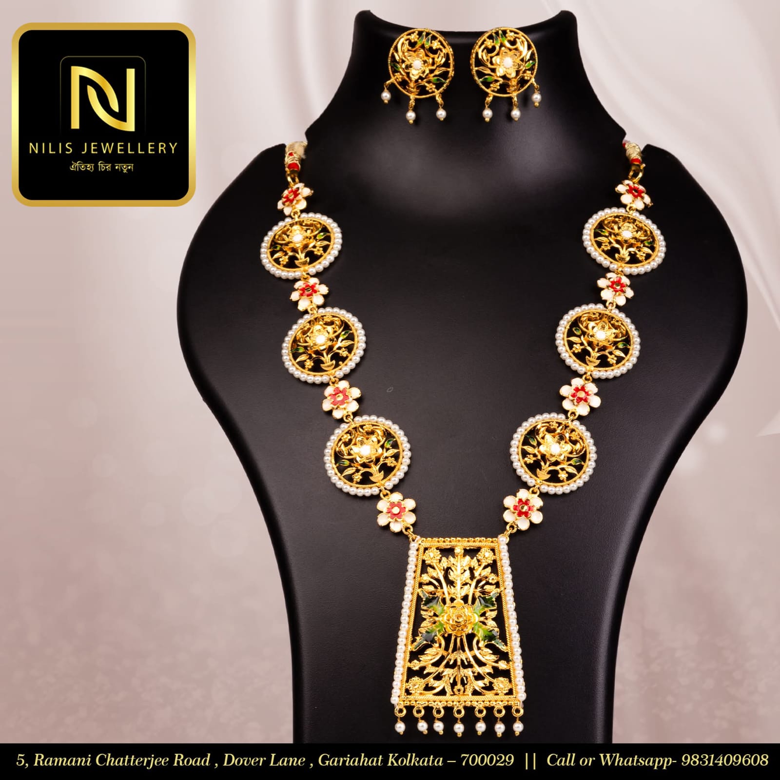 The long sitahaar with minakari and pearl work is a beautiful handcrafted piece of Nilis Jewellery.