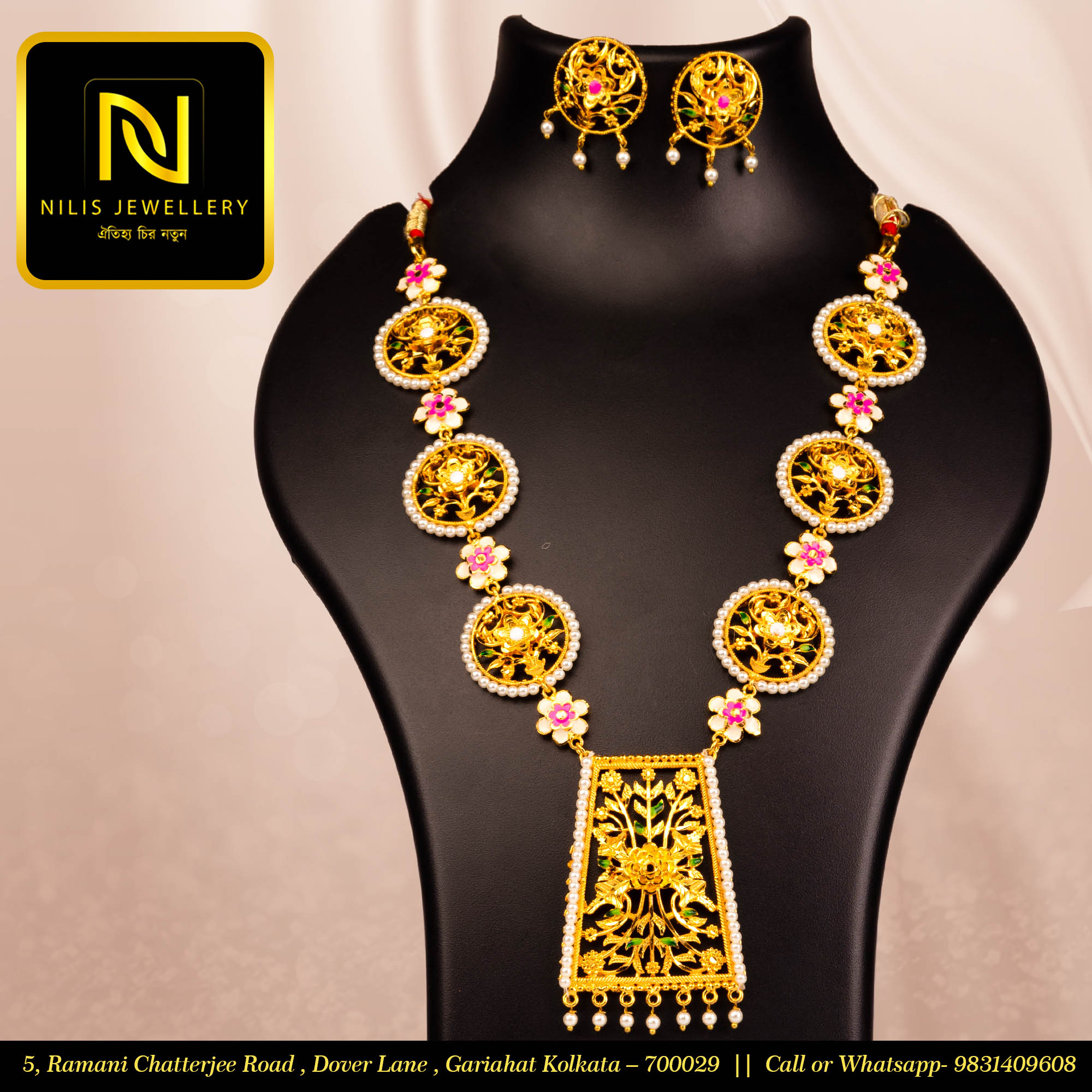 The long sitahaar with minakari and pearl work is a beautiful handcrafted piece of Nilis Jewellery.