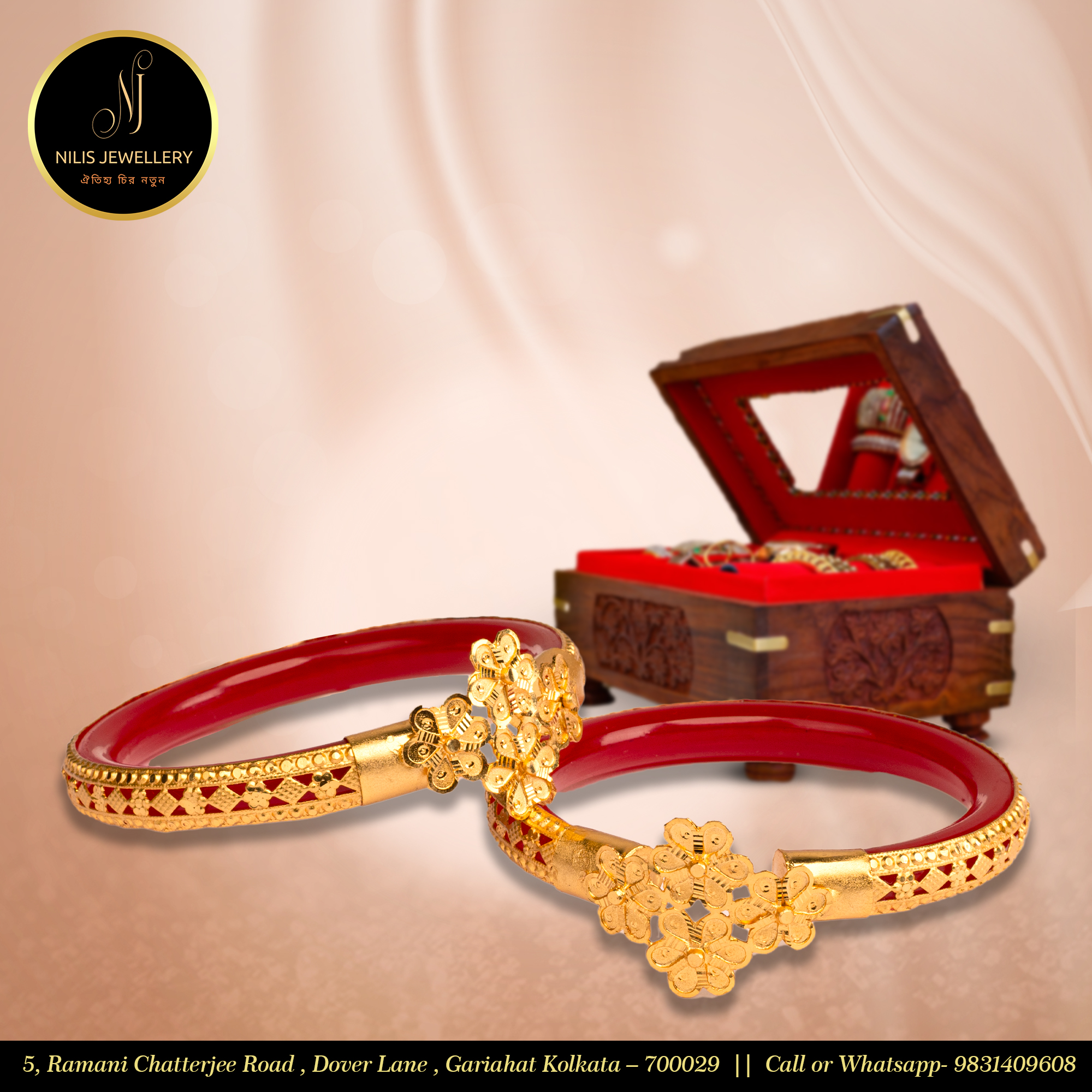 Fusion bangle with bala outer & pola inner filling. 4-flower design on top, 1.5 gm gold polish, 6-month color warranty. ₹1899 (1 pc) / ₹3499 (pair)